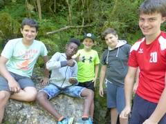 Über den Drahtsteg ging es dann hinunter zur Ache, wo wir mit einem Feuerstein ein Feuer entfachten. Darauf grillten einige von uns Würstchen und Speck. Das hat sehr lecker geschmeckt.